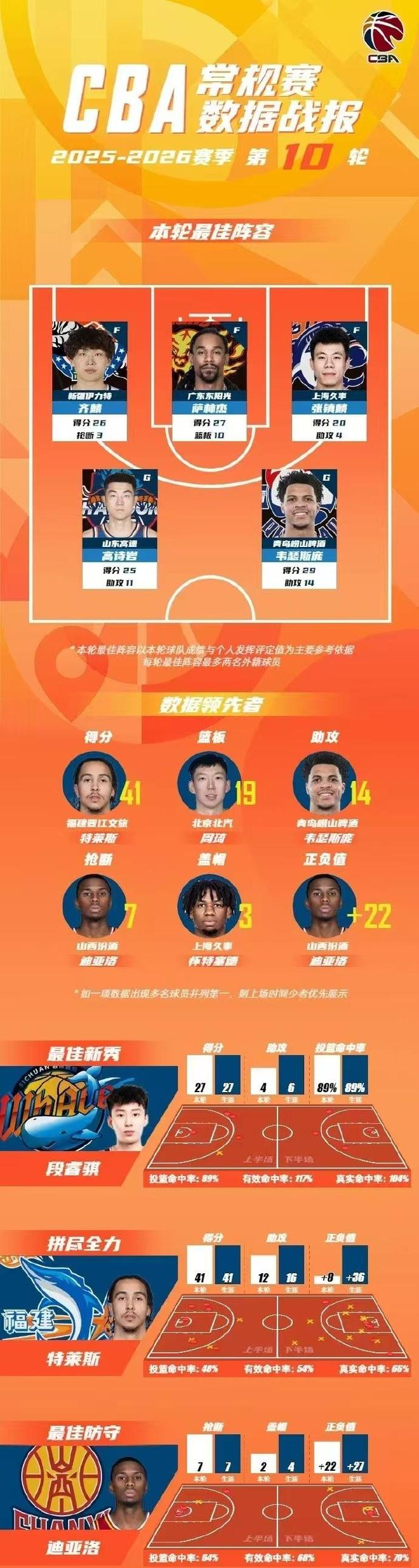 CBA官方公布常规赛第10轮最佳阵容,齐麟26分创赛季新高,率领新疆加时险胜福建,张镇麟20分加盟新高率领上海豪取6连胜升联赛第三,高诗岩25+7+11赛季最强一战,萨林杰27+10+6和韦瑟斯庞29分14助攻也入选。