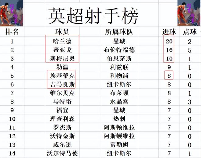 射手榜方面,哈兰德近段时间突然有些低迷,本轮打入一粒点球,20球继续领跑,不过他的领先优势被蒂亚戈持续缩小,现在只有4球的优势。塞梅尼奥10球排在第3,埃基蒂克缺阵,还是和吉马良斯,维尔贝克,马特塔等人并列第5。