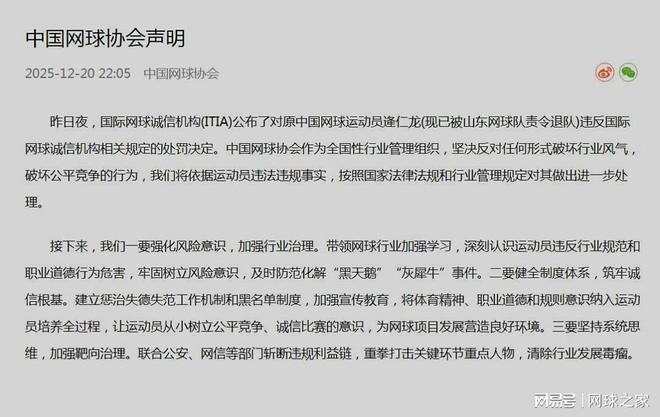 我们再来关注中国球员违规遭处分事情。一天前,国际网球诚信机构(ITIA)确认,中国网球运发动逄仁龙因操纵或希图操纵竞赛,被处以禁赛12年并罚款11万美元(其中7万美元暂缓执行)的处分。随后,中国网球协会发声明,对这一事情表态。